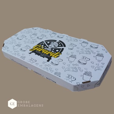 A caixa de pizza tipo “trem” foi desenvolvida especialmente para pizzarias que trabalham com pizzas em formato alongado, ideais para dividir sabores, criar apresentações diferenciadas e oferecer uma experiência única ao cliente.