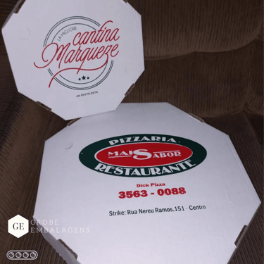 Produzida em papelão resistente, acomoda a pizza corretamente, mantendo o formato e ajudando a preservar a qualidade durante o transporte e a entrega.